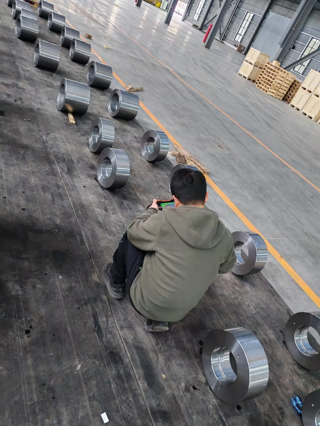 完成した鍛造リング製品のお客様の現場検査